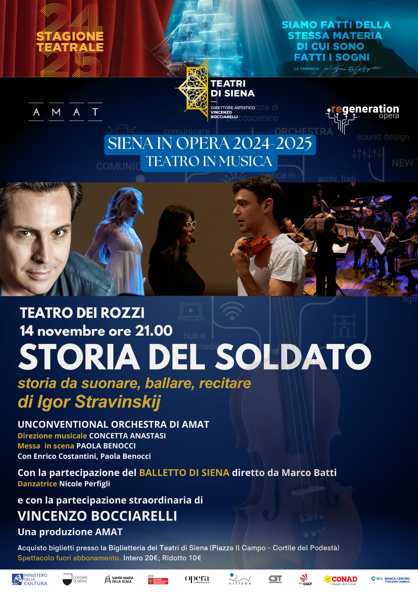 Stravinsky’s Storia del Soldato at the Rozzi Theatre, with the special participation of Vincenzo Bocciarelli. A work that speaks to today’s audience, exploring existential themes, the web, social networks, and technology.