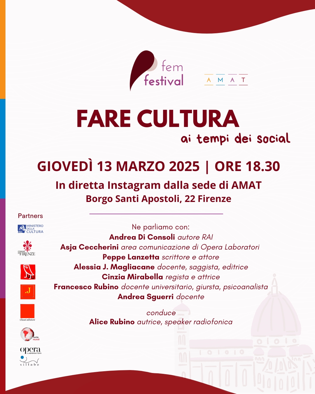Il Femfestival 2025 è un progetto di AMAT svolto con il Patrocinio del Comune di Firenze con la collaborazione di Opera Laboratori, Sillabe, JuJu Entertainment (Napoli), Punto J Einaudi e Classi Edizioni (Parigi), Iusta Mundi (Boston).