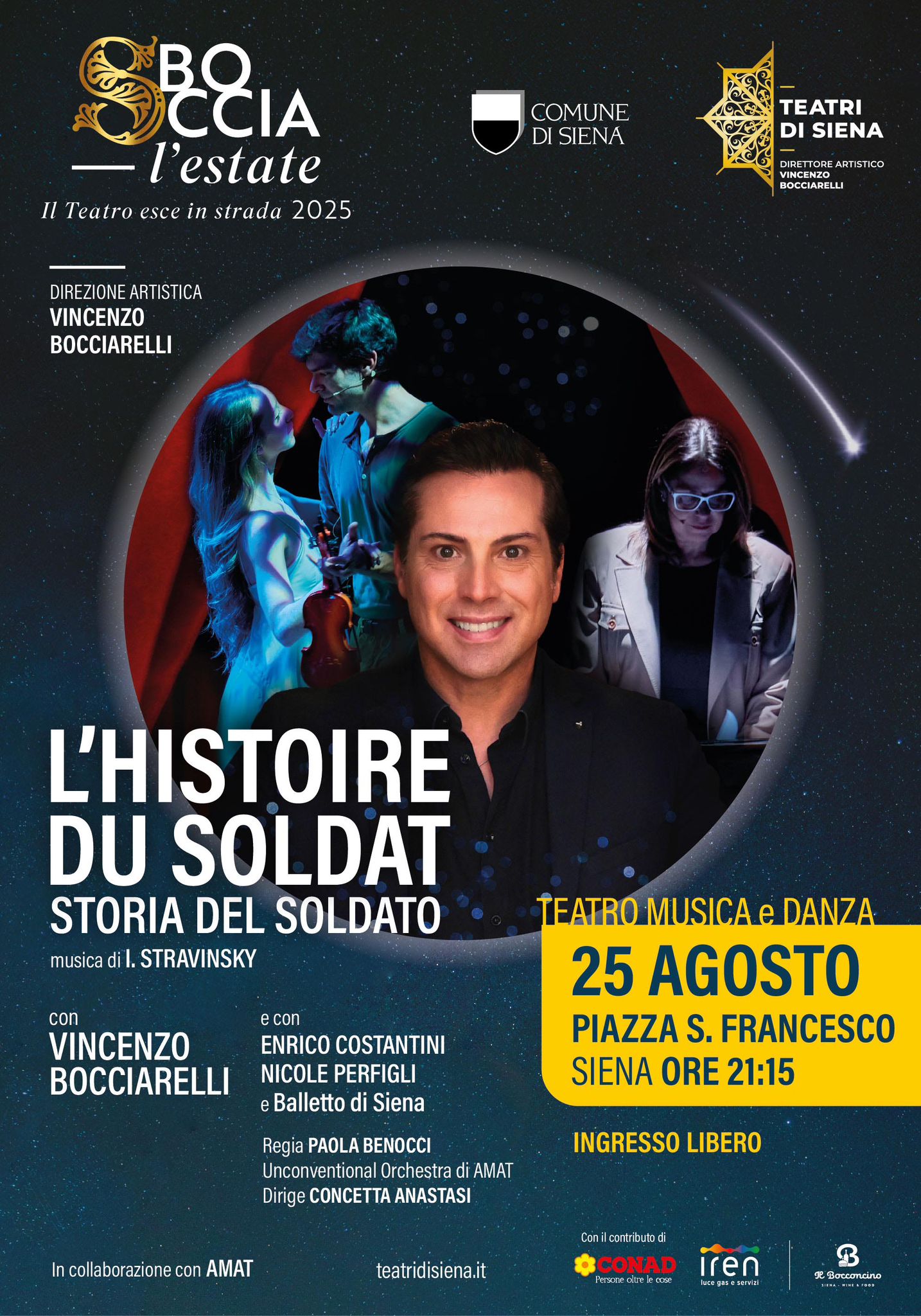 AMAT torna a Siena per l’ultimo appuntamento della stagione estiva 2025, presentando in Piazza San Francesco l’Histoire du Soldat di I. Stravinsky, all’interno di Sboccia l’estate, la stagione dei Teatri di Siena, diretti da Vincenzo Bocciarelli, che sarà anche protagonista dello spettacolo.
