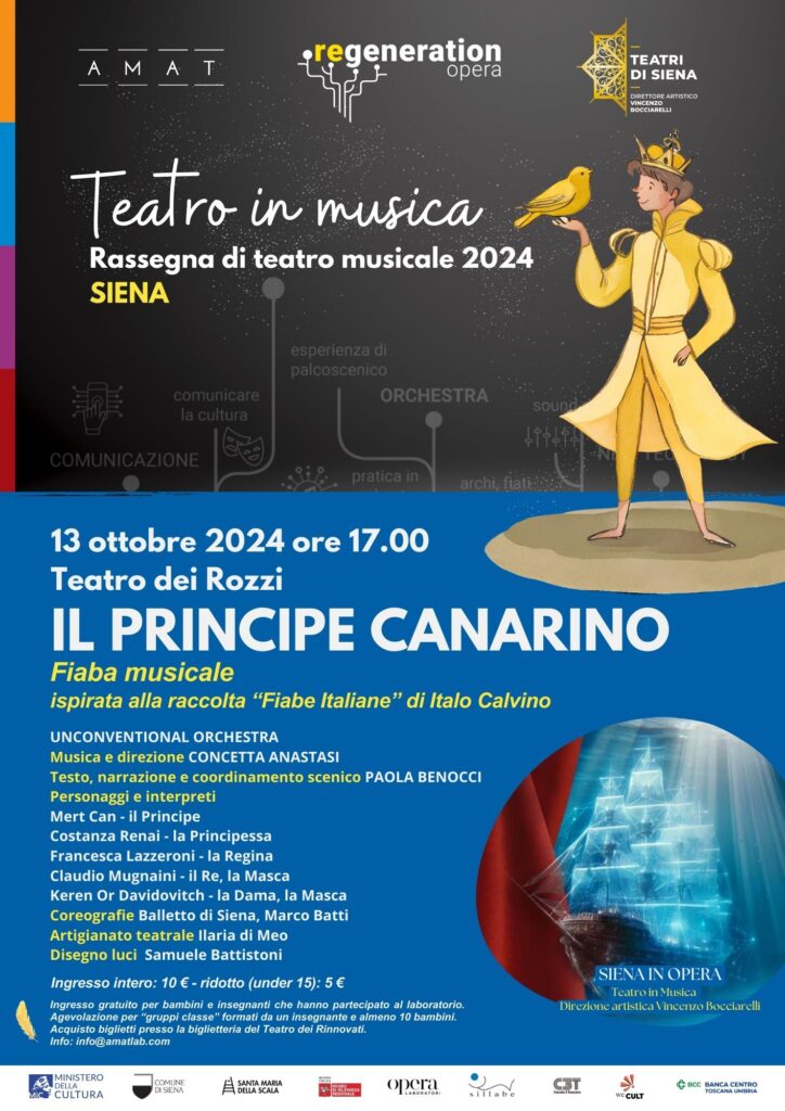 Domenica 13 ottobre sarà la volta de Il Principe Canarino, con musica di Concetta Anastasi su testo di Paola Benocci. Narrazione, orchestra, canto e danza si intrecciano in uno spettacolo per tutti, grandi e piccini.