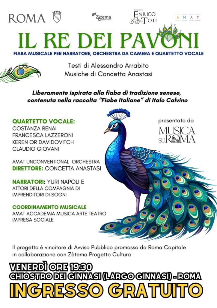 Il Re dei Pavoni, fiaba musicale liberamente ispirata a quella di tradizione senese, contenuta nella raccolta “Fiabe Italiane” di Italo Calvino, dopo il debutto al Teatro dei Rozzi di Siena nell’ottobre scorso, arriva al Chiostro dei Ginnasi (Largo Ginnasi) a Roma venerdì 19 luglio.