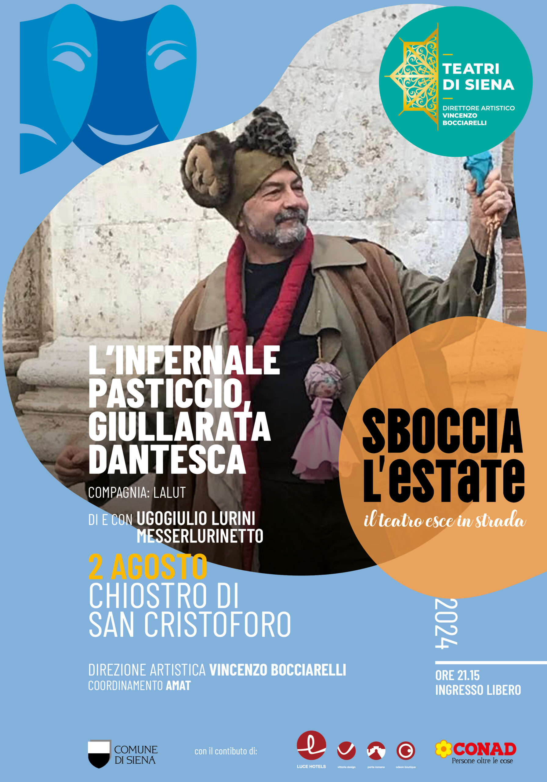 Sboccia l’estate: venerdì 2 agosto è la volta della de L’Infernale pasticcio di e con UgoGiulio Lurini, nei panni di Messerlurinetto: una cavalcata in terzine di endecasillabi, citazioni dotte, allusioni ironiche e richiami alla poesia del ‘200 -‘300, da Dante al nostro Cecco Angiolieri.