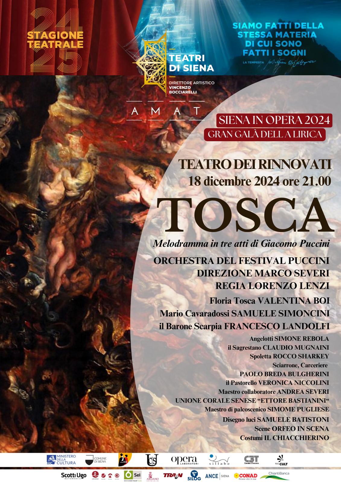 Protagonisti d’eccezione di questo allestimento sono l’Orchestra del Festival Puccini di Torre del Lago e un cast internazionale, diretti da Marco Severi con la regia di Lorenzo Lenzi. Il soprano Valentina Boi nel ruolo di Tosca, Samuele Simoncini, tenore senese, in quello di Mario Cavaradossi e il baritono Francesco Landolfi nel ruolo del Barone Scarpia. Nel cast anche Claudio Mugnaini (il Sagrestano), Simone Rebola (Angelotti), Rocco Sharkey (Spoletta), Paolo Breda Bulgherini (Sciarrone), Veronica Niccolini (il Pastorello). Disegno luci di Samuele Batistoni, costumi Il Chiacchierino, scene Orfeo in Scena.