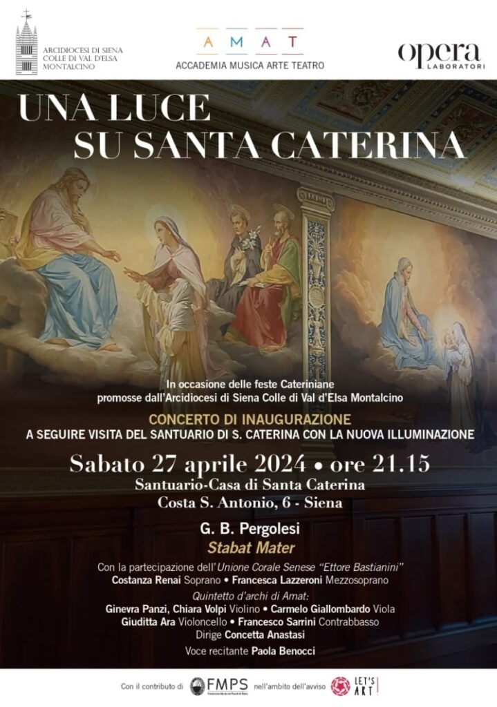 I luoghi così valorizzati saranno al centro di percorsi rivolti ai senesi e agli ospiti, per un’esperienza di spiritualità, cultura, arte e musica. L’evento di inaugurazione si svolgerà sabato 27 aprile 2024 alle ore 21.15, con un concerto realizzato da AMAT, che vedrà la partecipazione dell’Unione Corale Senese E. Bastianini. Paola Benocci introdurrà la parte musicale con alcune letture degli scritti di Santa Caterina e di Raimondo da Capua. Al termine del concerto sarà possibile visitare il Santuario.
