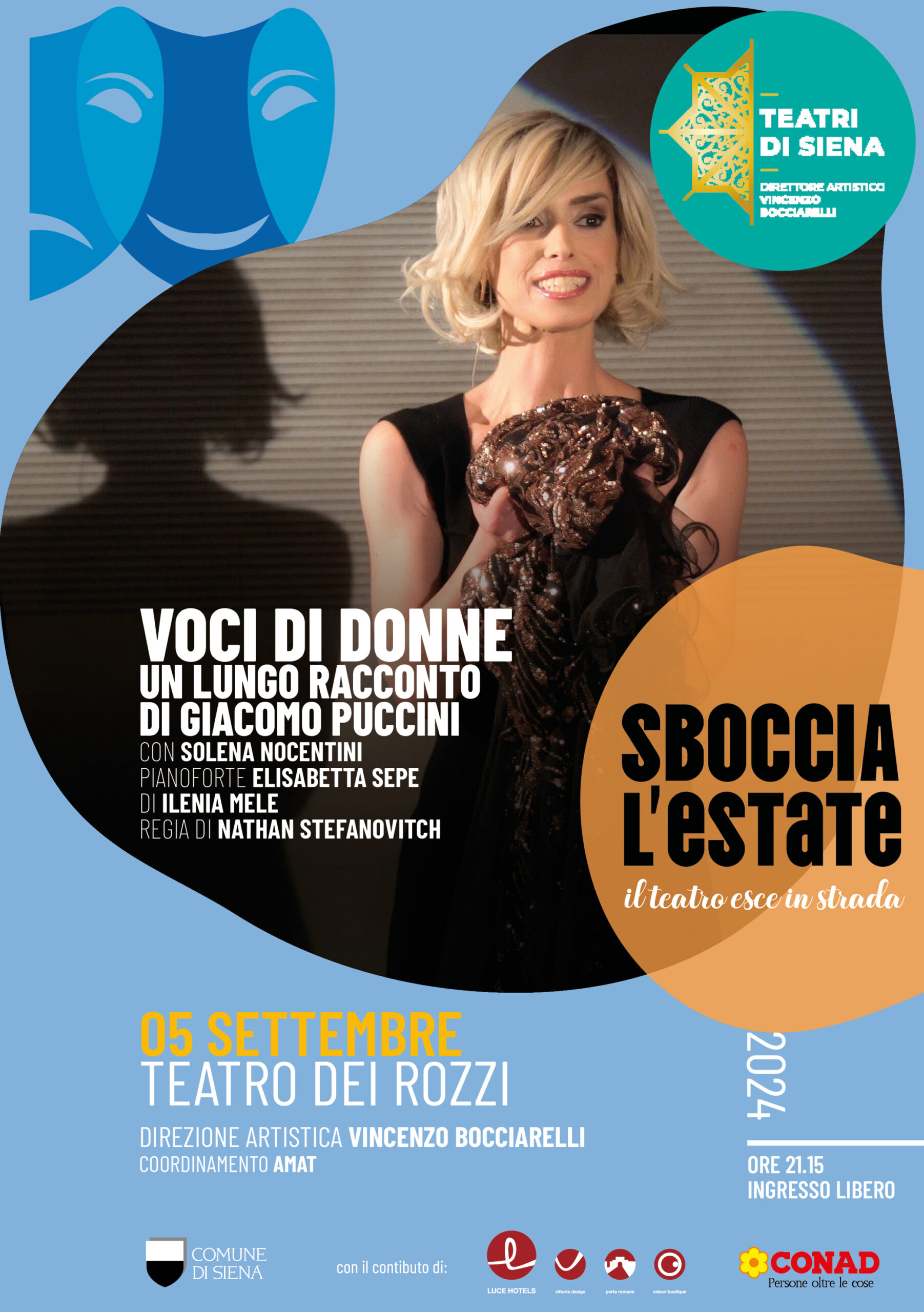 L’ultimo appuntamento della Rassegna estiva dei Teatri di Siena, con la direzione artistica di Vincenzo Bocciarelli, avrà luogo al Teatro dei Rozzi, giovedì 5 settembre alle 21.15 con “Voci di Donne, un lungo racconto di Giacomo Puccini”. Di Ilenia Mele, regia di Nathan Stefanovitch. Con Solena Nocentini e al pianoforte Elisabetta Sepe.